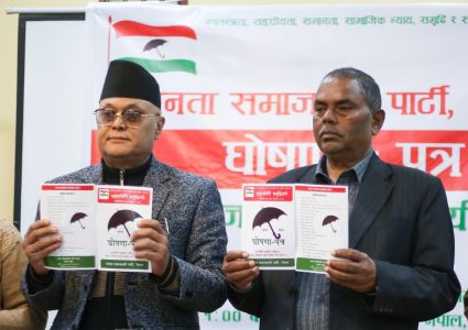 काठमाडौं । जनता समाजवादी पार्टी, नेपालले आगामी निर्वाचनका लागि आफ्नो घोषणापत्र सार्वजनिक गरेको छ । शुक्रबार काठमाडौंमा आयोजित एक कार्यक्रमकाबीच अध्यक्ष उपेनद्र यादवले घोषणापत्र सार्वजनिक गरेका हुन् । घोषणापत्रमा सो पार्टीले संविधान संशोधनका लागि पुनरावलोकन आयोग गठन गरी उक्त आयोगको सुझावका आधारमा काम अघि बढाउनुपर्ने बताएको छ । ‘राजनीतिक लोकतन्त्र, आर्थिक लोकतन्त्र, सामाजिक लोकतन्त्र, समावेशी […]