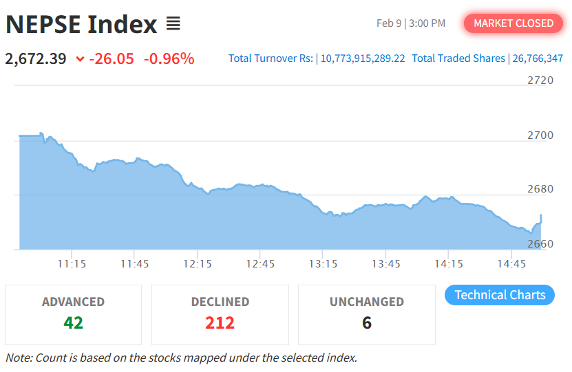 सोमबार नेप्से परिसूचक २६.०५ अंक घटेर २ हजार ६ सय ७२ दशमलव ३९ विन्दुमा झरेको छ।