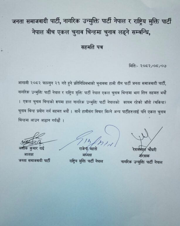 सहमति पत्रमा जनता समाजवादी पार्टीका अध्यक्ष अशोक कुमार राई, राष्ट्रिय मुक्ति पार्टी नेपालका अध्यक्ष राजेन्द्र महतो र नागरिक उन्मुक्ति पार्टी नेपालका संरक्षक रेशमलाल चौधरीले हस्ताक्षर गरेका छन्।