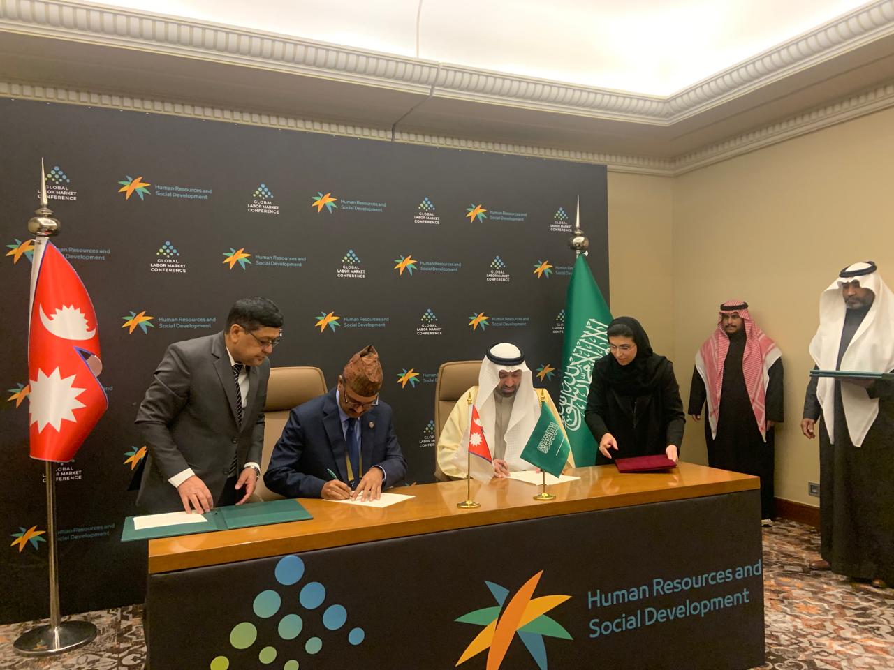 सम्झौतामा नेपालका तर्फबाट श्रम, रोजगार तथा सामाजिक सुरक्षामन्त्री राजेन्द्रसिंह भण्डारी र साउदी सरकारका तर्फबाट मानव संशाधन तथा सामाजिक विकासमन्त्री अहमद बिन सुलेमान अलराजीले हस्ताक्षर गरेका छन् ।