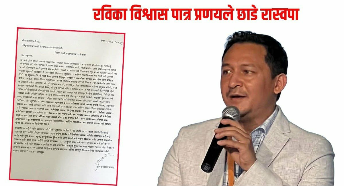 काठमाडौँ । प्रतिनिधि सभाको निर्वाचन नजिकिँदै गर्दा राष्ट्रिय स्वतन्त्र पार्टी रास्वपालाई झड्का लागेको छ । नीति र थिति बिना नै पार्टी चलिरहेको भन्दै रास्वपा छाड्नेको लहर चलिरहेका बेलामा रास्वपा सभापति रवि लामिछानेका विश्वास पात्र प्रणय शमशेर राणाले पार्टीबाट राजीनामा दिएका छन् ।